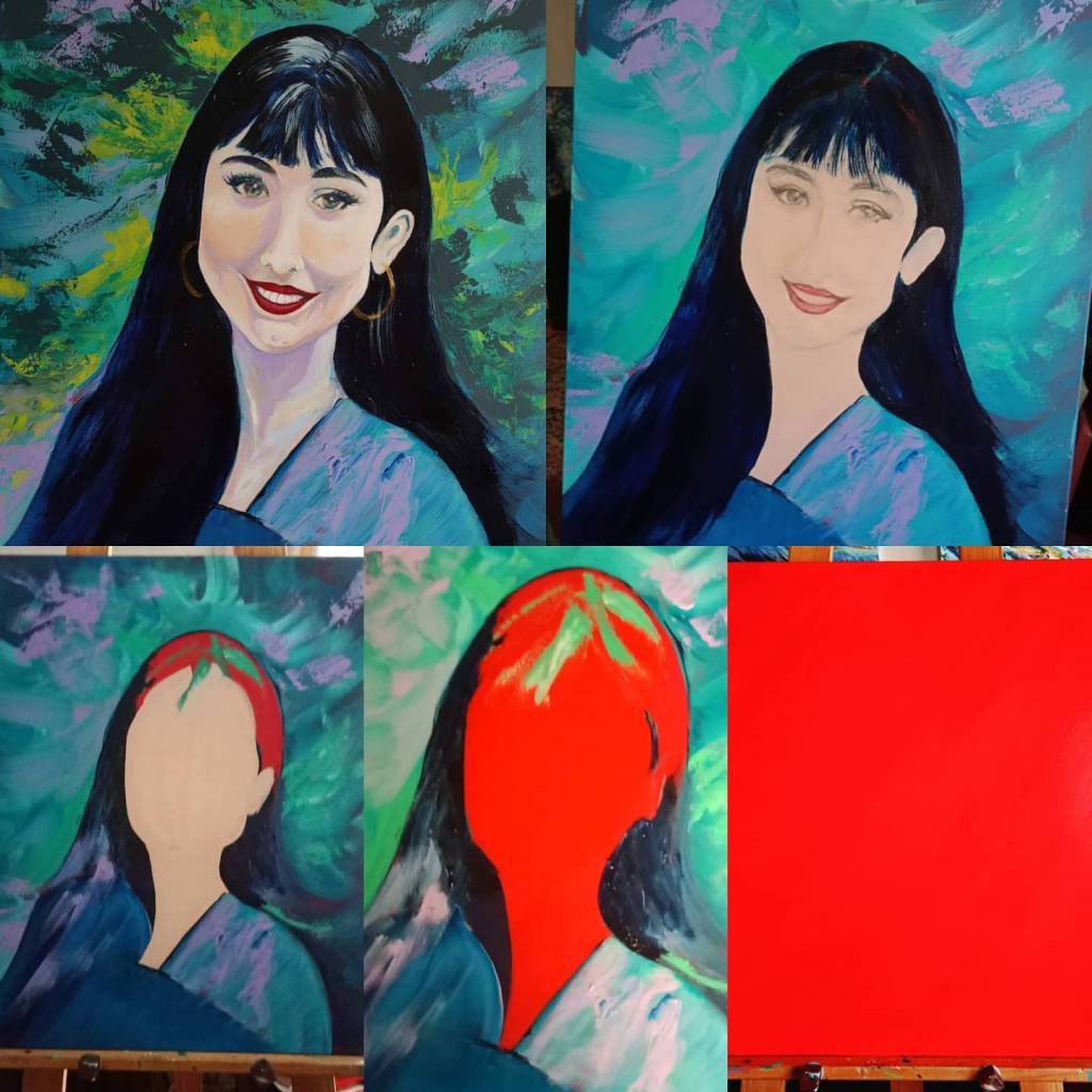Julia – Euphoric Porcelain, portrait transformation, started from painting the canvas solid red. Acrylic on stretched canvas 61 x 76 cm. See the transformation here.